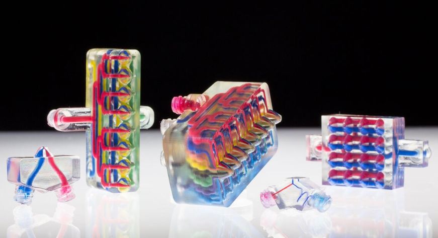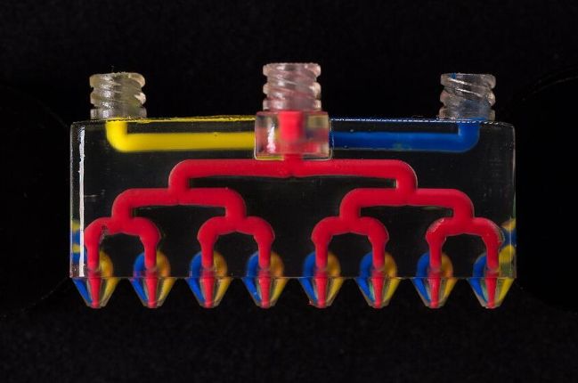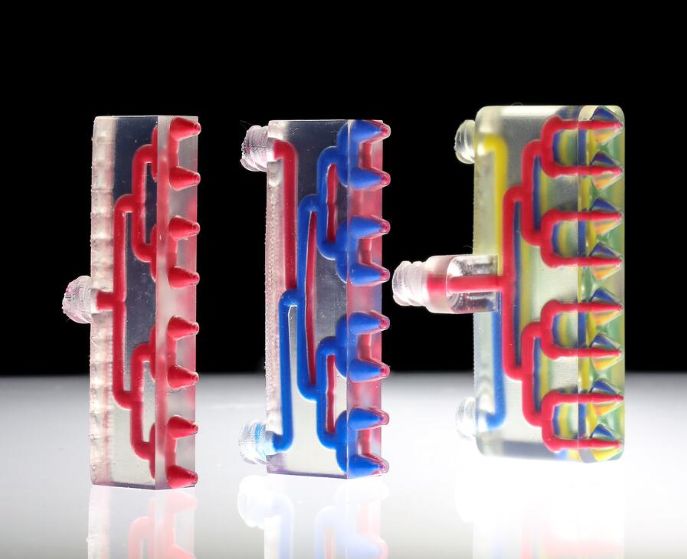 MM3D打印快速切换墨水的关键是打印头内的一系列Y形连接,多个墨水通道在一个输出喷嘴处汇合在一起。喷嘴的形状,打印压力和墨水粘度都经过精确计算和调整,因此,当将压力施加到连接点的其中一个“手臂”时,向下流过该手臂的墨水导致其他墨水不会流入。另一臂向后流动,这可以防止墨水混合并保持打印对象的质量。通过使用一组快速气动阀操作打印头,这种单向流动特性可以快速组装从每个喷嘴连续流出的多种材料的细丝,并可以3D打印多种材料的零件。此外,根据具有不同粘度和屈服应力的材料,还可以调整墨水通道的长度,从而比其他墨水更快或更慢地流动。