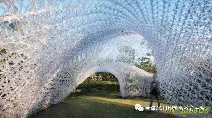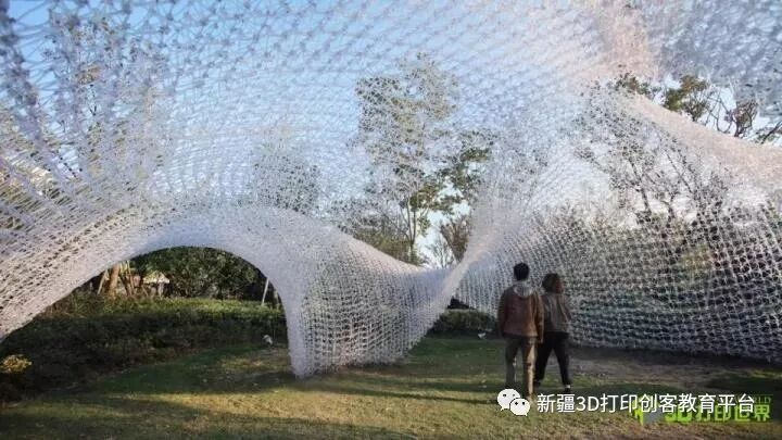 港城广场展示中心旁的这三座展亭包括:创盟国际&一造科技带来的“云亭”,直造建筑事务所的“柔物”,以及来自润•建筑工作室的“林泉高致集”。其中的“云亭”,是同济大学协同“创盟国际&一造科技”,首次运用MP材料实现的整体3D打印的结构性能化展亭。